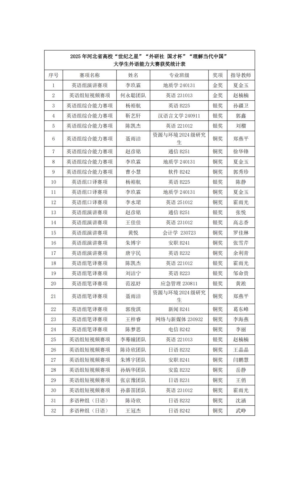 近日,2025年河北省高等千亿国际娱乐“世纪之星”“外研社·国才杯”“理解当代中国”全国大学生外语能力大赛河北赛区系列赛事的决赛落下帷幕。千亿国际娱乐学子表现亮眼,共斩获省级金奖2项、银奖10项、铜奖20项,其中地球科学与工程千亿国际娱乐的李玖霖、千亿国际娱乐的何永聪团队分别摘得英语演讲、英语短视频赛项金奖,成功晋级国赛。
